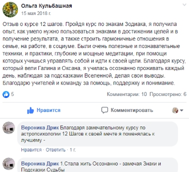 Здесь я познакомилась со своим преподавателем, которая как Фея, каждый урок отправляла нас в сказочное путешествие Мир Звезд. С этого момента я влюбилась в Астрологию! Галина подарила мне практическое руководство по осознанной жизни. Она научила меня не просто существовать в этом мире и пытаться выжить, а жить полной полной жизнью и с максимальным комфортом.