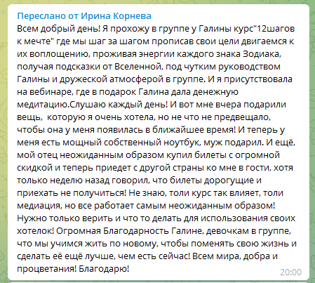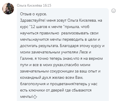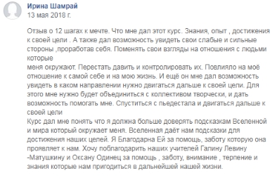 На курсе «12 шагов к мечте» я усвоила техники исполнения желаний, о которых я и не подозревала. На курсе я научилась заряжаться энергией значимых событий и использовать ее как инструмент на пути к мечте. Я научилась расшифровывать все подсказки Вселенной, которые указывают на правильность выбранного мной пути для реализации своей мечты. Я научилась чувствовать, какие внутренние убеждения препятствуют моему успеху и как их прорабатывать. Я поняла, что мне нужно избавиться от сомнений и страхов – сделать что-нибудь не так. Я поняла, что мало чего-то желать, мало правильно формулировать свои желания, для его осуществления, важно еще чтобы это желание было действительно моим. Оказывается, все мои желания не исполнялись, потому что не соответствовали задачам души и моему предназначению, все мои желания шли не от души , а от ума. Я изучила медитации, упражнения на открытие энергетического потока исполнения желаний. Научившись прислушиваться к желаниям души, мне открылась дверь в совершенно другой мир, в котором присутствует изобилие того, что мне действительно необходимо.