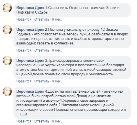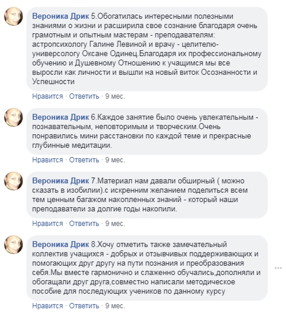 Очень хорошо объясняли преподаватели Галина Левина и Людмила Степанова знаки зодиака, астропериоды, психотипы, проводили упражнения и медитации – я их до сих пор практикую, считаю, что от них большая помощь.