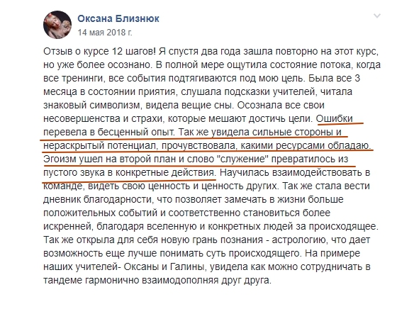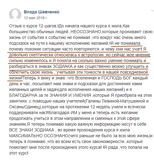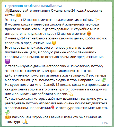 На курс " 12 шагов к мечте " я пришла с желанием реализовать свои мечты ,поставленные цели . В первую очередь очень хотелось знать, истинно эти желания мои ? В поиске своего пути ,есть сомнения ,беспокойства . А ,правильный ты сделала выбор ? Действительно ,это всё твоё ? На протяжении всего курса ,мы получали подсказки Вселенной ,учились их расшифровывать . Каждую неделю проживали в каждом знаке Зодиака ,понимая все положительные и несовершенные стороны каждого знака . Анализируя каждую неделю в Скайп чате ,делали выводы ,что нужно наработать а ,что изменить . Сейчас пройдя синтез и сделав выводы ,стало очень легко и радостно !