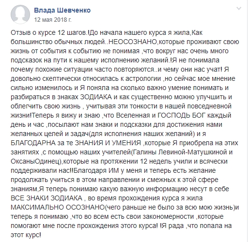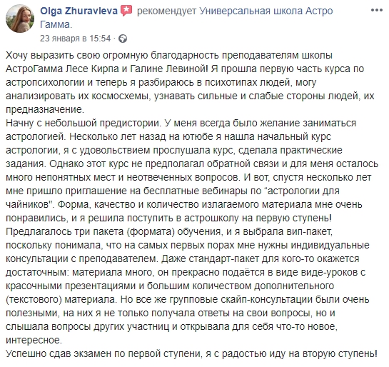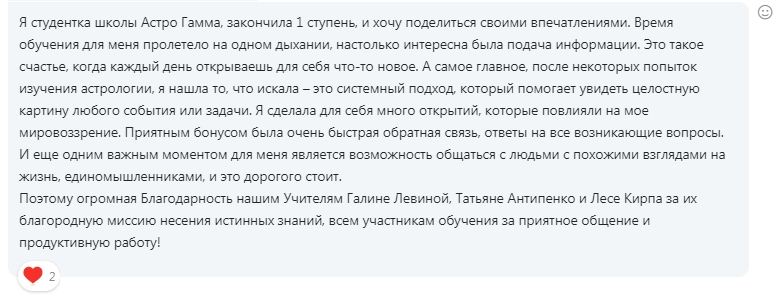 Я попала на этот курс , даже не мечтая ! Все решил случай ! В конце августа я получила письмо от Галины Левиной ,где она поздравляла именинников и предложила дать консультацию всем желающим . Я заполнила форму ,мне назначили день и время . К моему сожалению и удивлению ,я перепутала день ,хотя ждала 2 недели ! Галина , любезно ответила ,что даст мне второй шанс . Неделю мы не могли подобрать время и в пятницу меня пригласили к ним в школу на " День открытых дверей" . Я на тот момент не думала ,что этот день перевернёт мою жизнь ! Астрологией увлекаюсь с детства ,но начать обсуждение , даже не думала ! Я училась и продолжаю обучение на другом курсе . Если реально взвесить - невозможно ! Но , все не реальное , оказывается возможно ! Нужно просто этого очень хотеть !!!