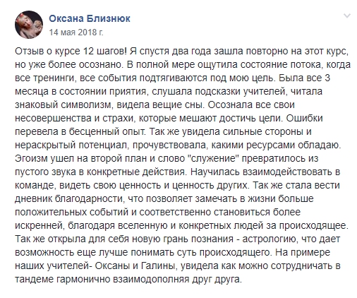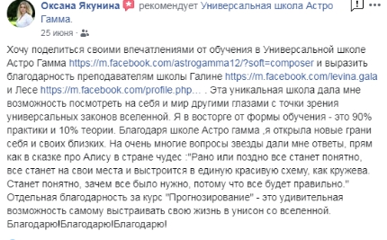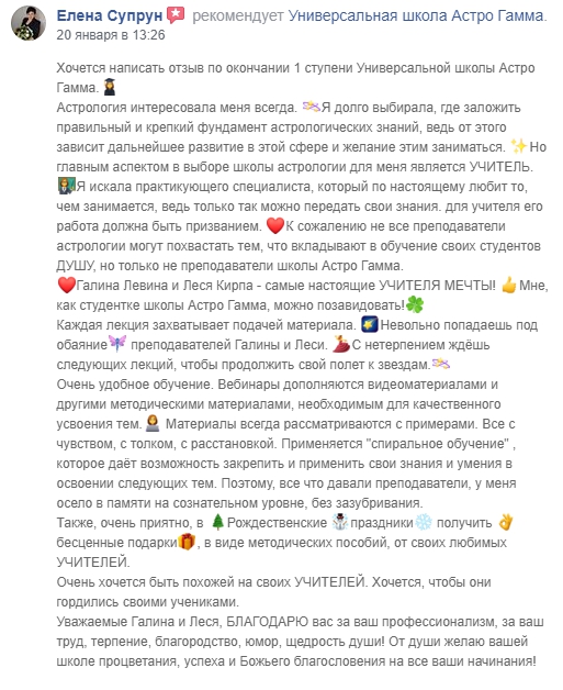 - Ученик созрел - учитель пришел ! Я прошла четырех месячное обучение у них в школе . Не одного дня я не пожалела об этом . Материала очень много ,но он подаеться в такой лёгкой форме ,что хочется конспектировать все лекции . Я не хотела пропустить какие то ключевые вещи . К каждому занятию идут дополнительные материалы : таблицы ,примеры . Очень важно ,что есть обратная связь . Сам процесс обучения построен великолепно ! Очень приятно общаться с людьми и понимать ,что они это не читают с какого - то листа ,они так живут ! Для меня самая большая ценность ,даже не их знания - не обсуждается ! Душа этих прекрасных женщин ! В наше время найти людей ,чтоб тебе в чем то помогли ,подсказали и не осудили ? ! А это дорогого стоит !
